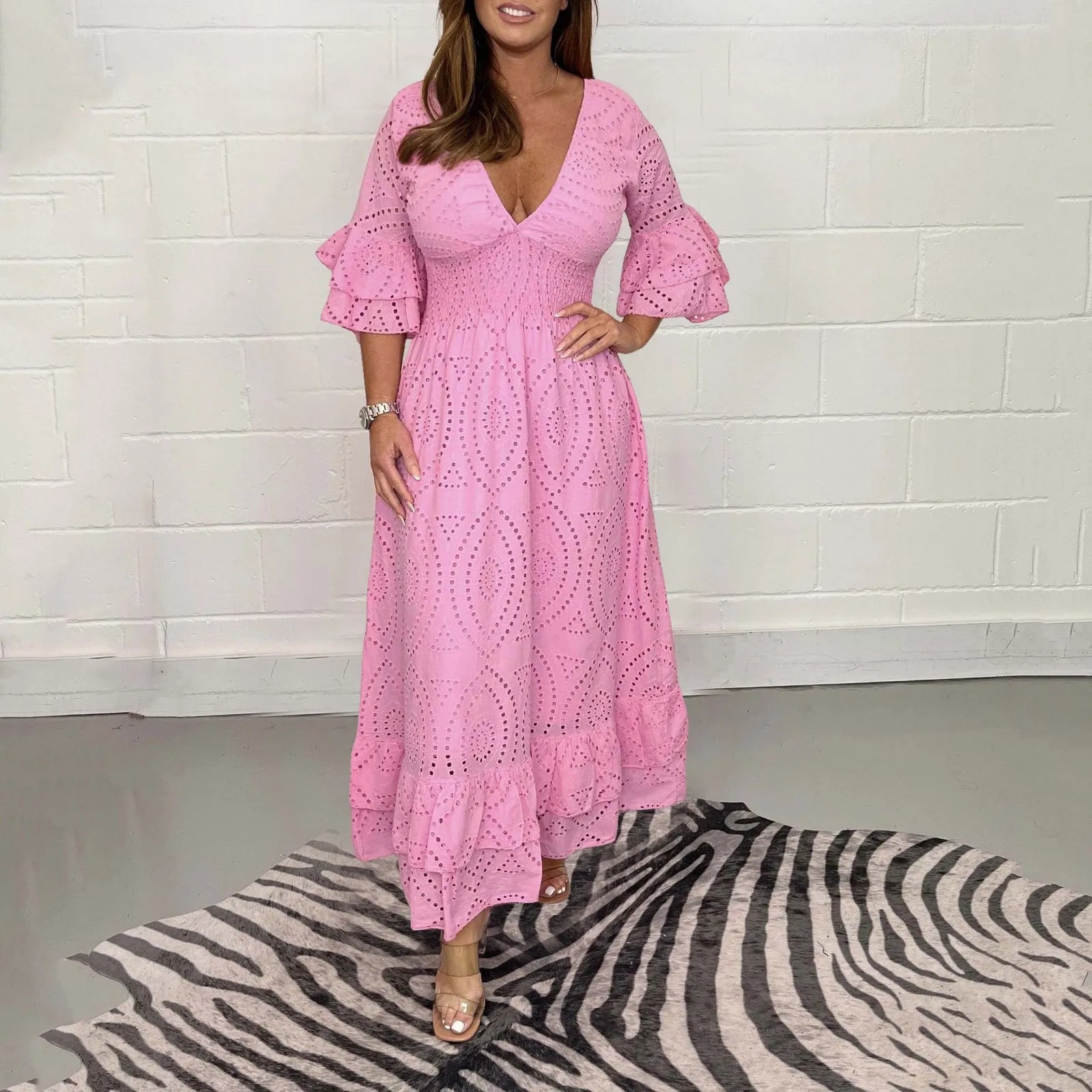 Embroidery Anglaise Ruffle Sleeves Midi Dress Embroidery Dress For Women V Neck High Waist Lace Boho Dresses With Sleeves