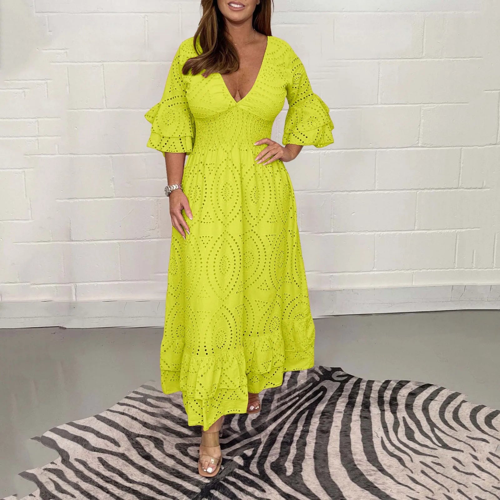 Women's Elegant V-neck White Hollow Out Party Long Dress Summer 2024 New Casual Flare Sleeve Holiday Dress Female Clothing